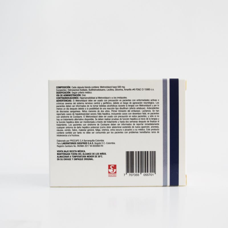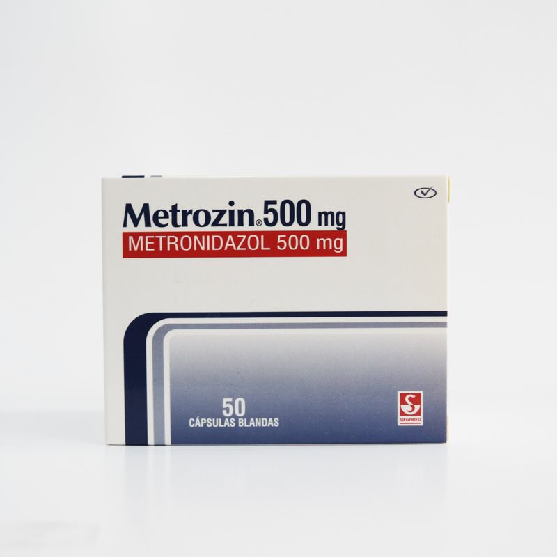 Metrozin Metronidazol 500 Mg Caja X 50 Cápsulas Siegfried. Este producto es un medicamento, no exceder su consumo. Leer indicaciones y contraindicaciones, si los síntomas persisten consultar al médico. Venta bajo fórmula médica.