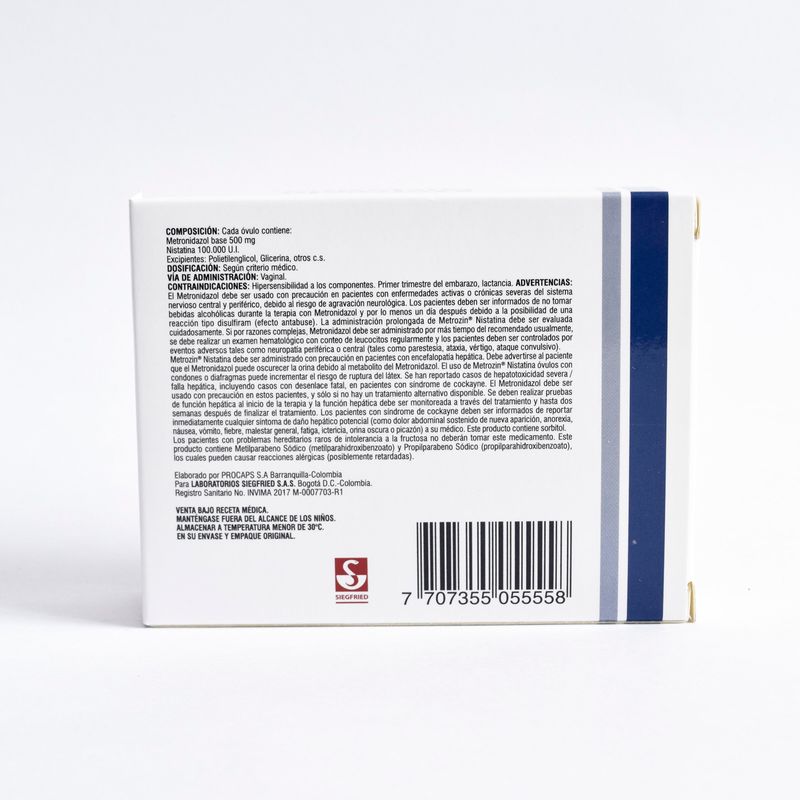 Metrozin Nistatina Metronidazol Caja X 10 Óvulos Siegfried. Este producto es un medicamento, no exceder su consumo. Leer indicaciones y contraindicaciones, si los síntomas persisten consultar al médico. Venta bajo fórmula médica.