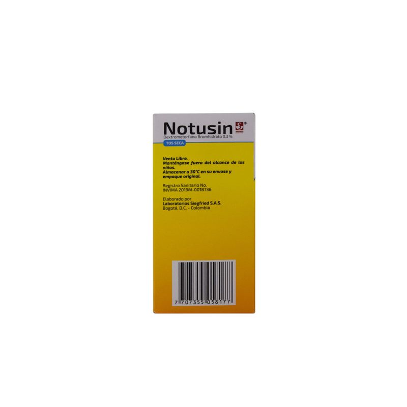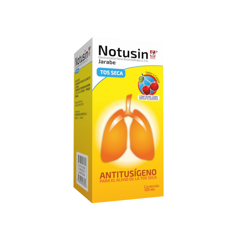 Notusin Tos Seca Dextrometorfano Bromhidrato 0,2 Gr Guayacolato Gliceril 2 Gr Jarabe Frasco X 120 Ml Solución Oral Siegfried. Este producto es un medicamento, no exceder su consumo. Leer indicaciones y contraindicaciones, si los síntomas persisten consultar al médico.