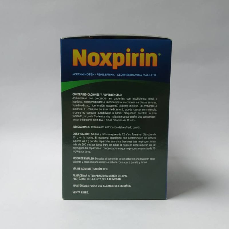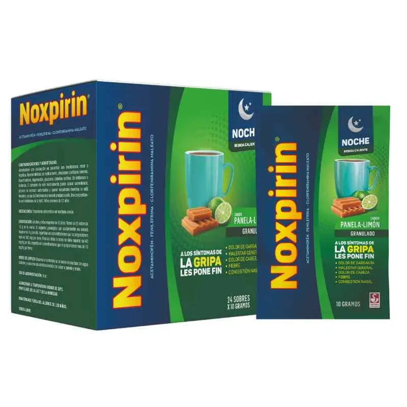 Noxpirin Caliente Noche Panela Caja X 24 Sobres Siegfried. Este producto es un medicamento, no exceder su consumo. Leer indicaciones y contraindicaciones, si los síntomas persisten consultar al médico.