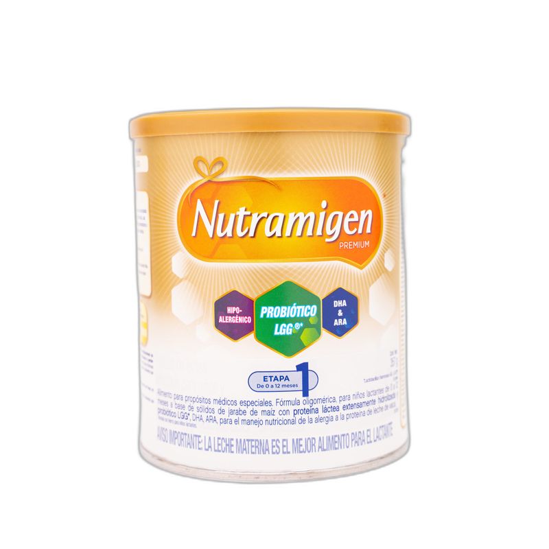 Fórmula infantil Nutramigen Premium con LGG, presentación de 357 gramos, diseñada para bebés con alergias alimentarias.