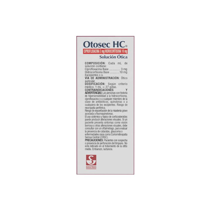 Otosec Hc Ciprofloxacina 3 Mg Hidrocortisona 10 Mg Gotas Jarabe Frasco X 10 Ml Solución Siegfried. Este producto es un medicamento, no exceder su consumo. Leer indicaciones y contraindicaciones, si los síntomas persisten consultar al médico. Venta bajo fórmula médica.