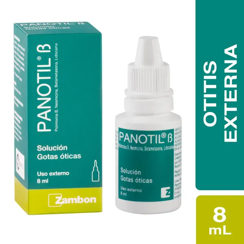 Panotil-B Solución Otica Betametasona 1 Mg Lidocaina Clorhidrato 40 Mg Neomicina 3.7 Mg Polimixina 10000 8 Ml Ui Zambon. Este producto es un medicamento, no exceder su consumo. Leer indicaciones y contraindicaciones, si los síntomas persisten consultar al médico. Venta bajo fórmula médica.