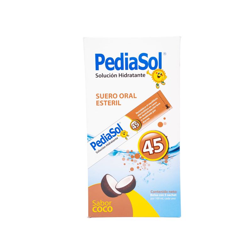 Pediasol 45 Coco Sachet 100 Ml 5 Unidades Solución Oral Quibi. Este producto es un medicamento, no exceder su consumo. Leer indicaciones y contraindicaciones, si los síntomas persisten consultar al médico.