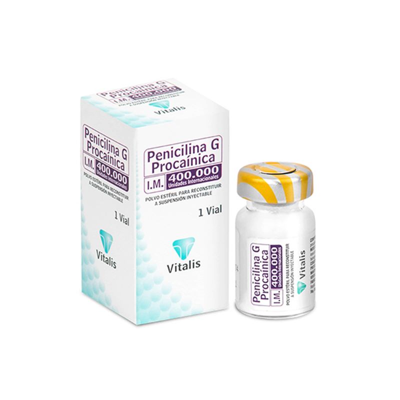 Penicilina G Procai 400 U.I Caja X 1 Ampolla Solución Inyectable Vitalis. Este producto es un medicamento, no exceder su consumo. Leer indicaciones y contraindicaciones, si los síntomas persisten consultar al médico. Venta bajo fórmula médica.