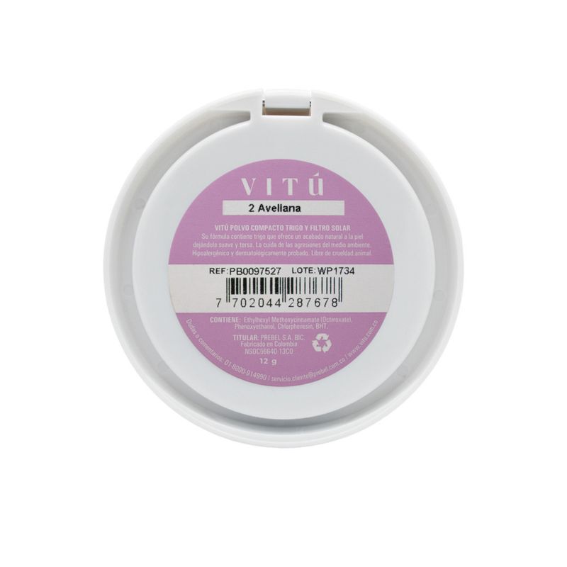Polvo Compacto Vitú Trigo 2 Avellana El Polvo Compacto Vitú Trigo en el tono 2 Avellana es un cosmético facial diseñado para matificar la piel, fijar el maquillaje y unificar el tono, con ingredientes derivados del trigo para una textura suave. El tono Avellana es un color medio con subtonos neutros o cálidos.