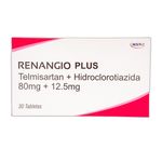 Renangio Plus Telmisartan Hidroclorotiazida 80 Mg + 12,5 Mg Caja X 30 Tabletas Msn Labs. Este producto es un medicamento, no exceder su consumo. Leer indicaciones y contraindicaciones, si los síntomas persisten consultar al médico. Venta bajo fórmula médica.