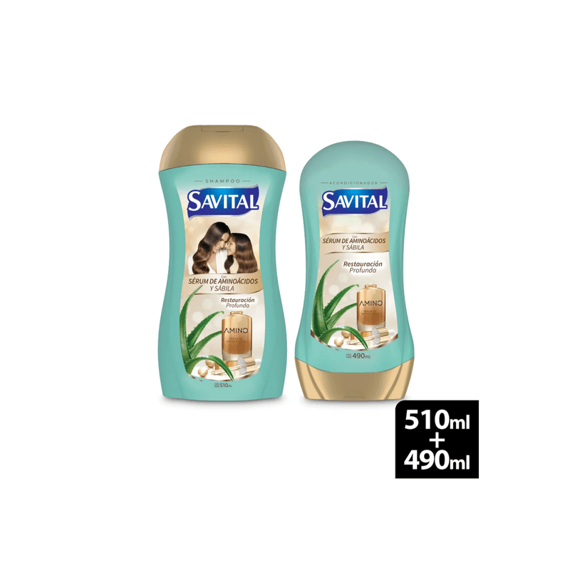 Shampoo Aminoácidos x510ml + Acondicionador x490ml Savital Un champú enriquecido con aminoácidos en una presentación de 510 ml. Este champú está formulado para limpiar el cabello mientras aprovecha los beneficios de los aminoácidos, que ayudan a fortalecer la fibra capilar, reparar el daño y mejorar la apariencia general del cabello.