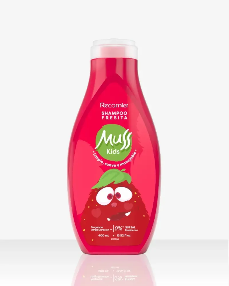 Shampoo Muss Fresita Edición Especial, presentado en frasco de 400 ml. Formulación suave diseñada para la limpieza del cabello, con un agradable aroma a fresa. Edición especial conmemorativa. Un producto para la higiene capilar, disponible en la sección de cuidado capilar de droguerías y farmacias.
