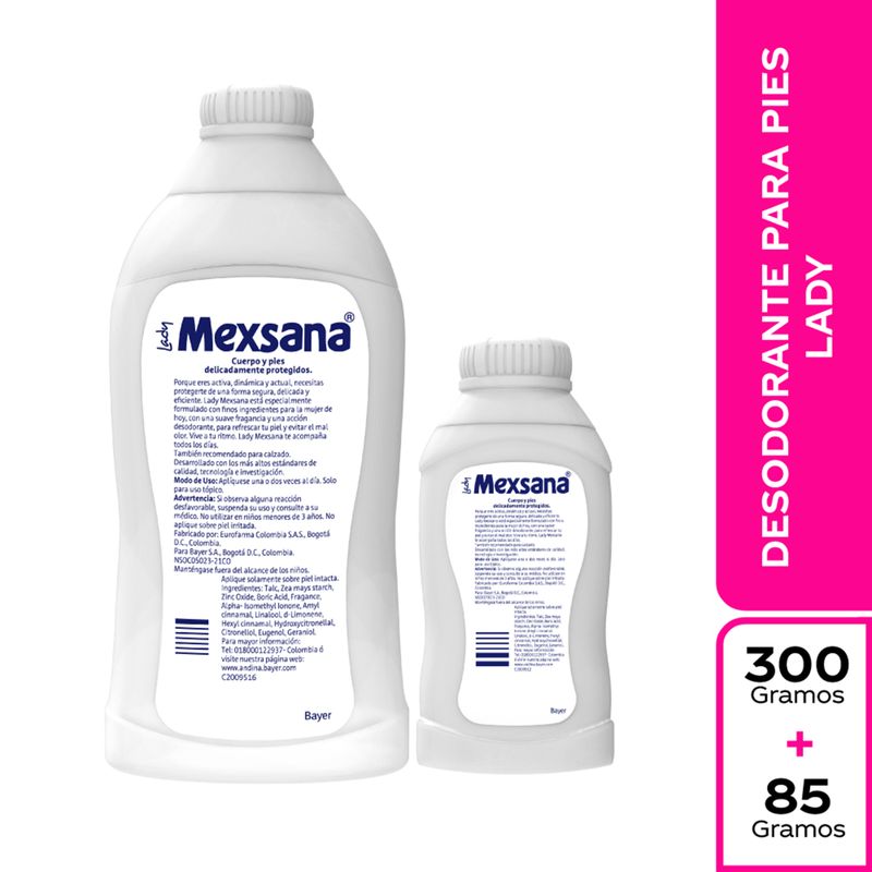 Talco Lady en frasco de 300 gr más Mexsana 85 con precio especial de Bayer es una