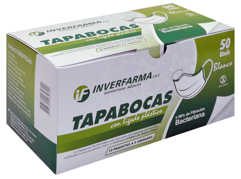 El Tapabocas desechable en color blanco, con elástico y empaque individual, está diseñado para ofrecer comodidad y protección. Su estructura de 3 pliegues maximiza la cobertura y eficacia, mientras que el material transpirable permite una respiración fácil.