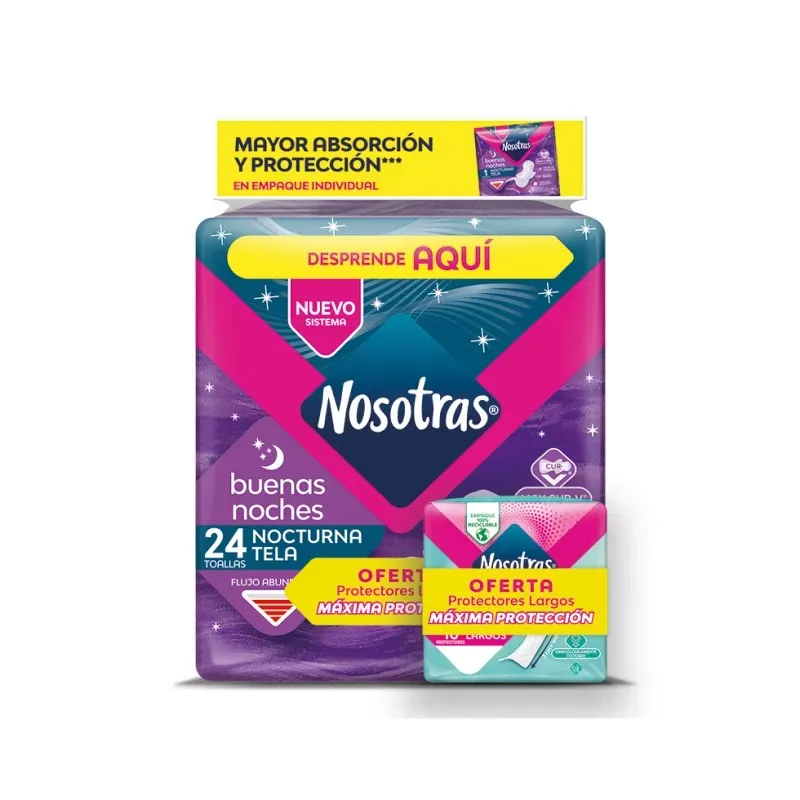 Toallas Higiénicas Nosotras Buenas Noches Tela 24 Unidades + Protector 10 Familia