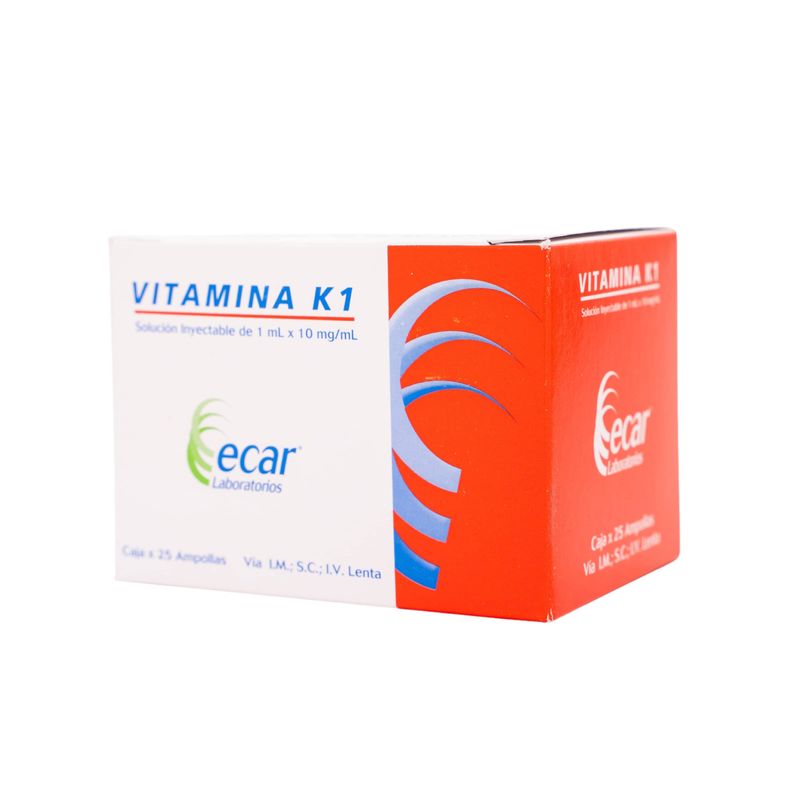 Vitamina K Fitomenadiona 10 Mg Inyectable 1 Ml Caja X 25 Ampollas Ecar. Este producto es un medicamento, no exceder su consumo. Leer indicaciones y contraindicaciones, si los síntomas persisten consultar al médico. Venta bajo fórmula médica.