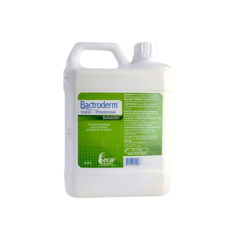 Yodopovidona Bactroderm 10% Frasco X 3.5 L Solución Ecar. Este producto es un medicamento, no exceder su consumo. Leer indicaciones y contraindicaciones, si los síntomas persisten consultar al médico.