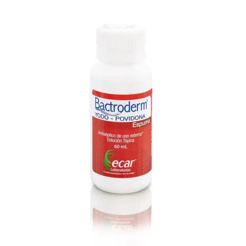 Yodopovidona Bactroderm Espuma 8% Frasco X 60 Ml Solución Ecar. Este producto es un medicamento, no exceder su consumo. Leer indicaciones y contraindicaciones, si los síntomas persisten consultar al médico.
