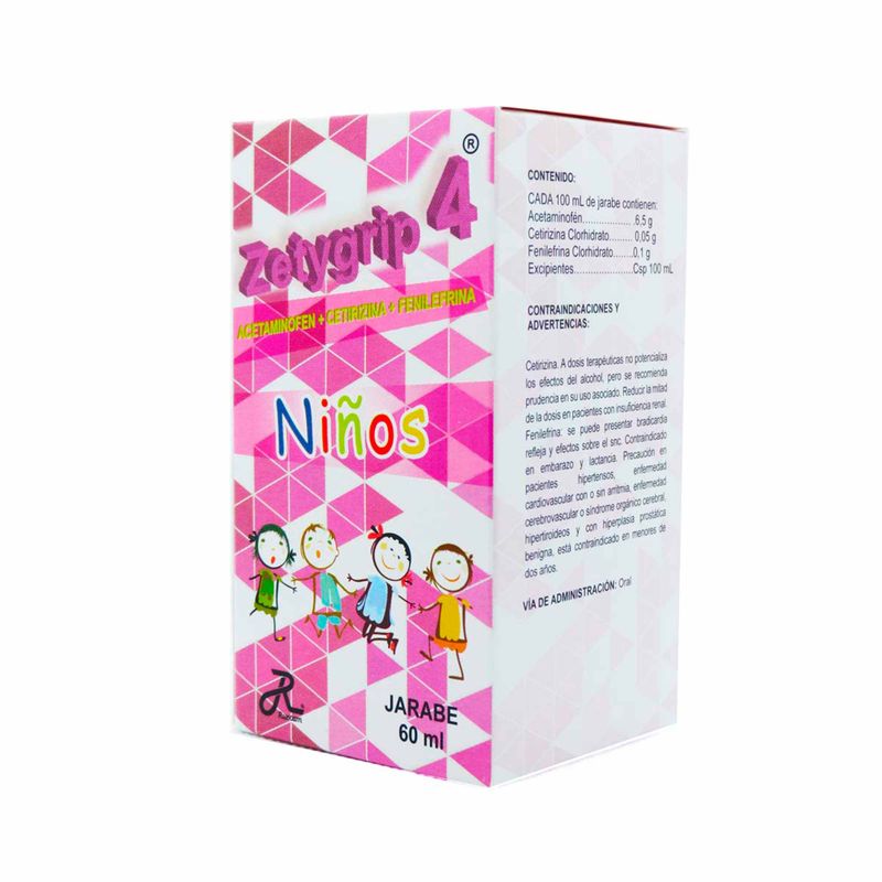Zetygrip-4 Jarabe Niños Frasco X 60 Ml Ruecam Zetygrip-4 Jarabe Niños está formulado para el alivio de los síntomas del resfriado y la gripe en niños. El frasco contiene 60 ml de jarabe con una combinación de ingredientes para aliviar la congestión nasal, la tos, la fiebre y el malestar general en niños. La dosis debe ajustarse según la edad y el peso del niño.